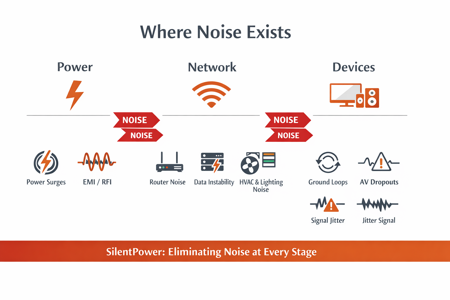 From boardrooms and hotels to cinemas, studios and large-scale infrastructure, many systems quietly suffer from hidden electrical and network noise. This interference can lead to unstable networks, unreliable playback, reduced audio and visual quality, and inconsistent performance. These issues are often misdiagnosed, when in reality the root cause is poor power and signal integrity.